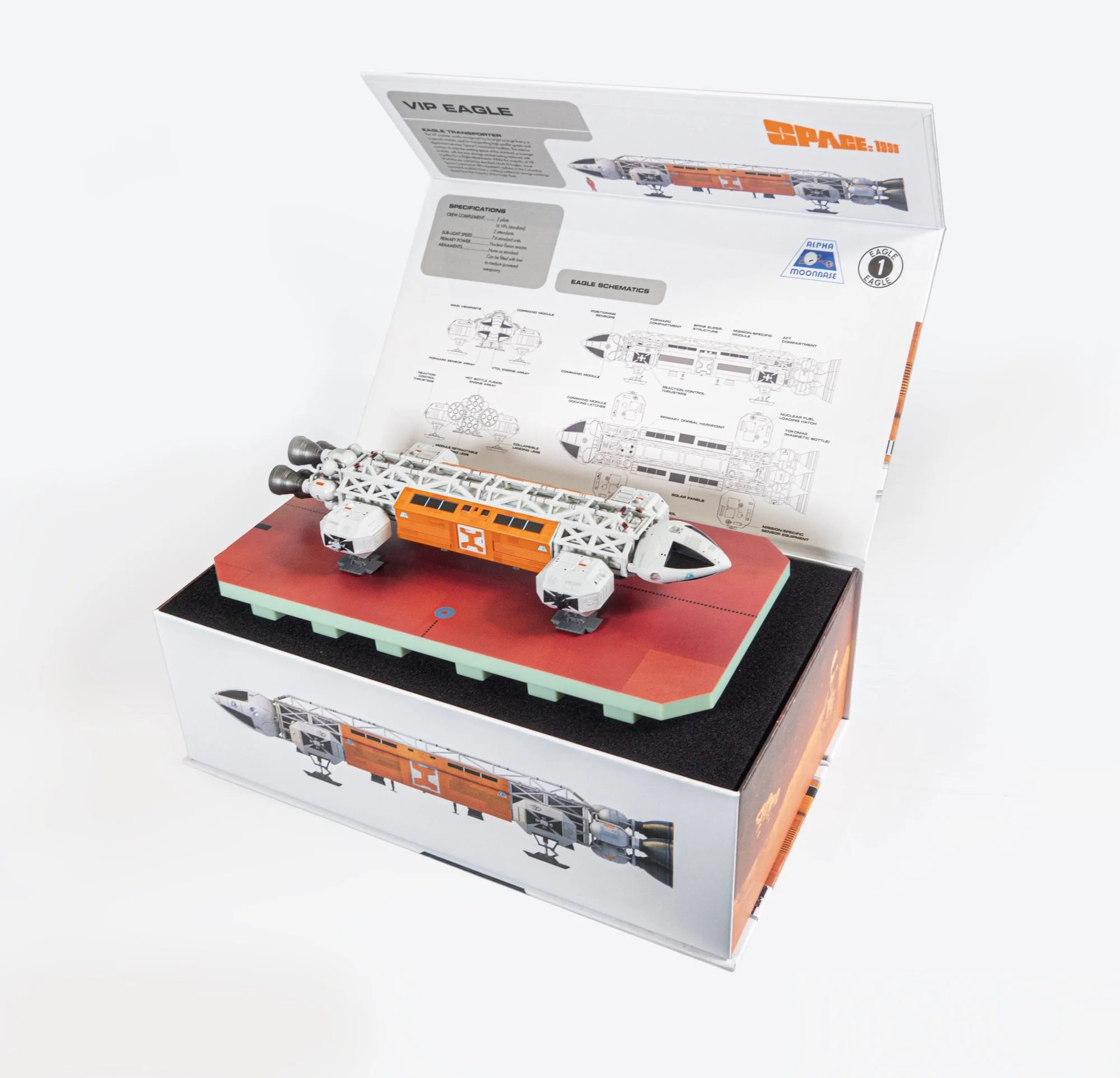 The Eagle is secured in foam housing within a deluxe white presentation box, which marks the model as part of our premium range. The soft-touch matt finish of the box interior provides a full craft schematic, craft specifications and detailed information on the craft. These features, combined with the limited production Certificate of Authenticity, make the Eagle Transporter a highly sought-after collectors’ item for fans of the series and collectors of iconic science fiction memorabilia alike.