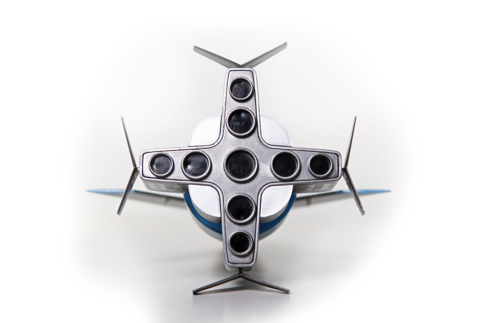 Constructed primarily of metal with plastic nosecone and engines